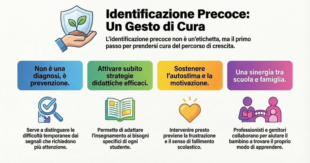 Serve piuttosto a riconoscere precocemente alcuni segnali di rischio, distinguendo le normali difficoltà temporanee da quelle che potrebbero richiedere maggiore attenzione.Questo permette di: attivare strategie didattiche più efficaci, sostenere l’autostima dei bambini, prevenire frustrazione e demotivazione scolastica.