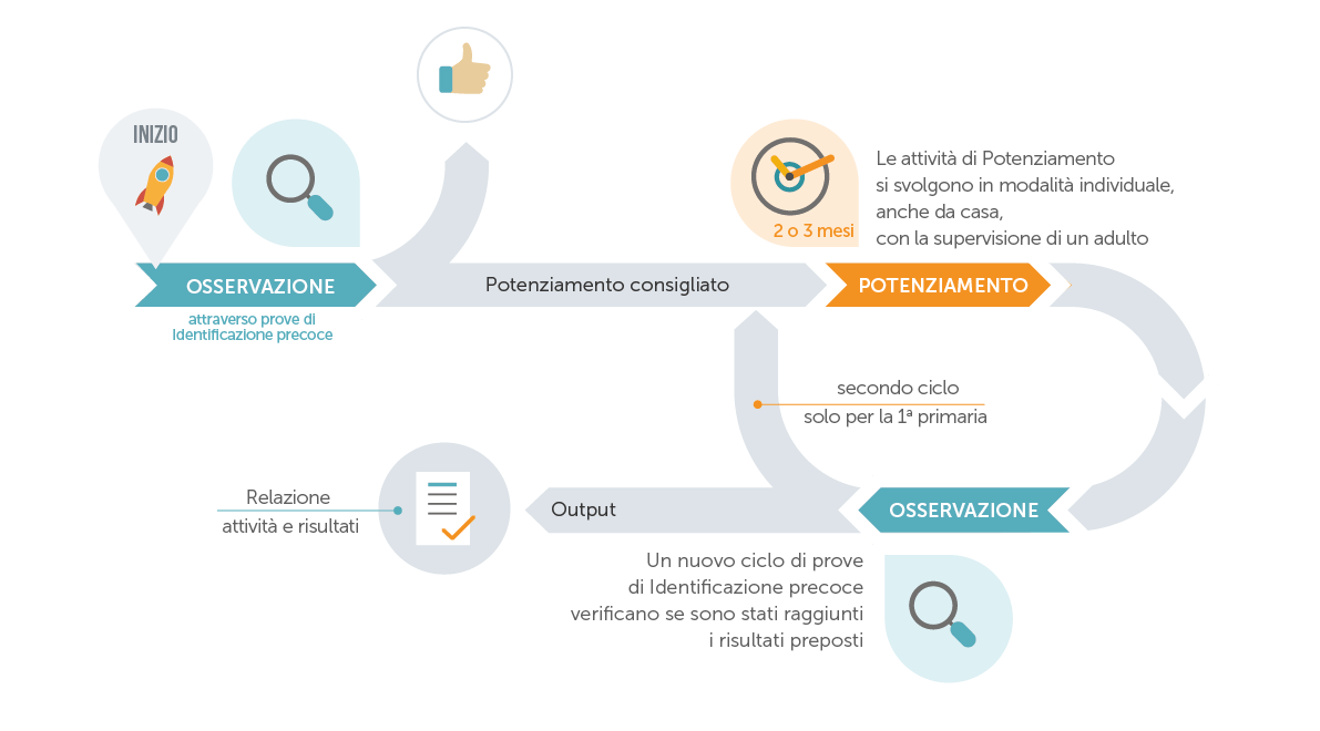 Il Progetto offre agli insegnanti sia uno strumento di individuazione precoce delle difficoltà di apprendimento validato scientificamente, che il successivo percorso di potenziamento da attivare solo nei casi di richiesta di attenzione con la collaborazione della famiglia e la supervisione di personale specializzato.