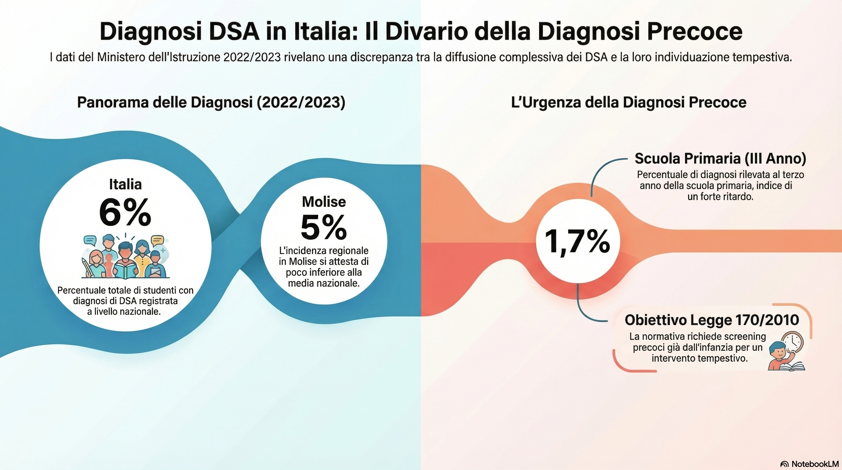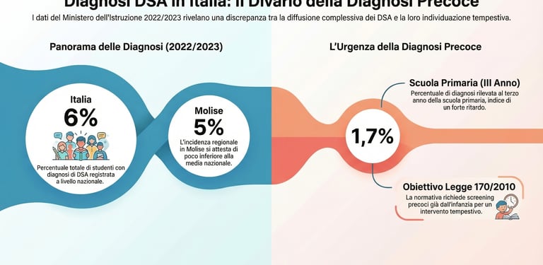 I DSA sono attualmente sotto diagnosticati, riconosciuti tardivamente o confusi con altri disturbi. Secondo i dati del Ministero dell’Istruzione e del Merito 2022/2023 le diagnosi di DSA nelle scuole italiane di attesta intorno al 6% del totale degli studenti (5% nel Molise)